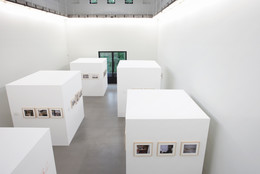 The exhibition design of Dan Graham Presents New Jersey reflects every notion of the serial and drifting through (sub)urban surroundings – a quality also visible in the themes addressed by the photo series as well as in the making of the photographs. Five white cubes differing minimally in dimension provide the framework for wandering through a spatial display that links an urban-like arrangement of representational forms with a view, inscribed in the photo series, of the paradoxes of difference and repetition.