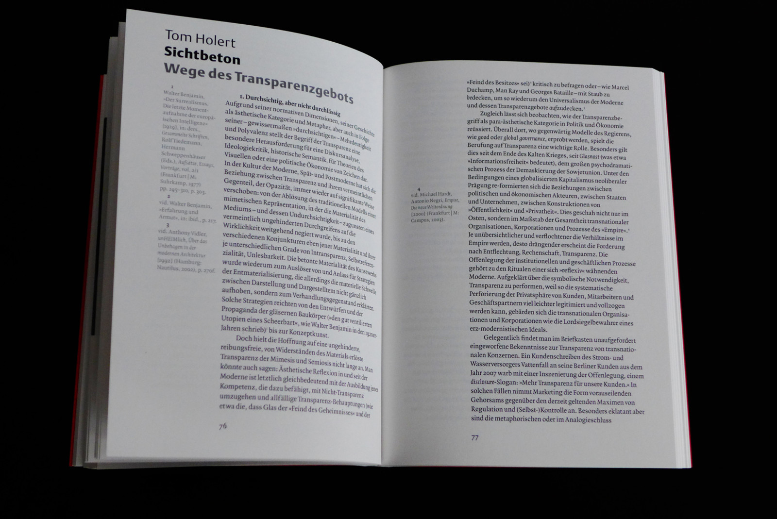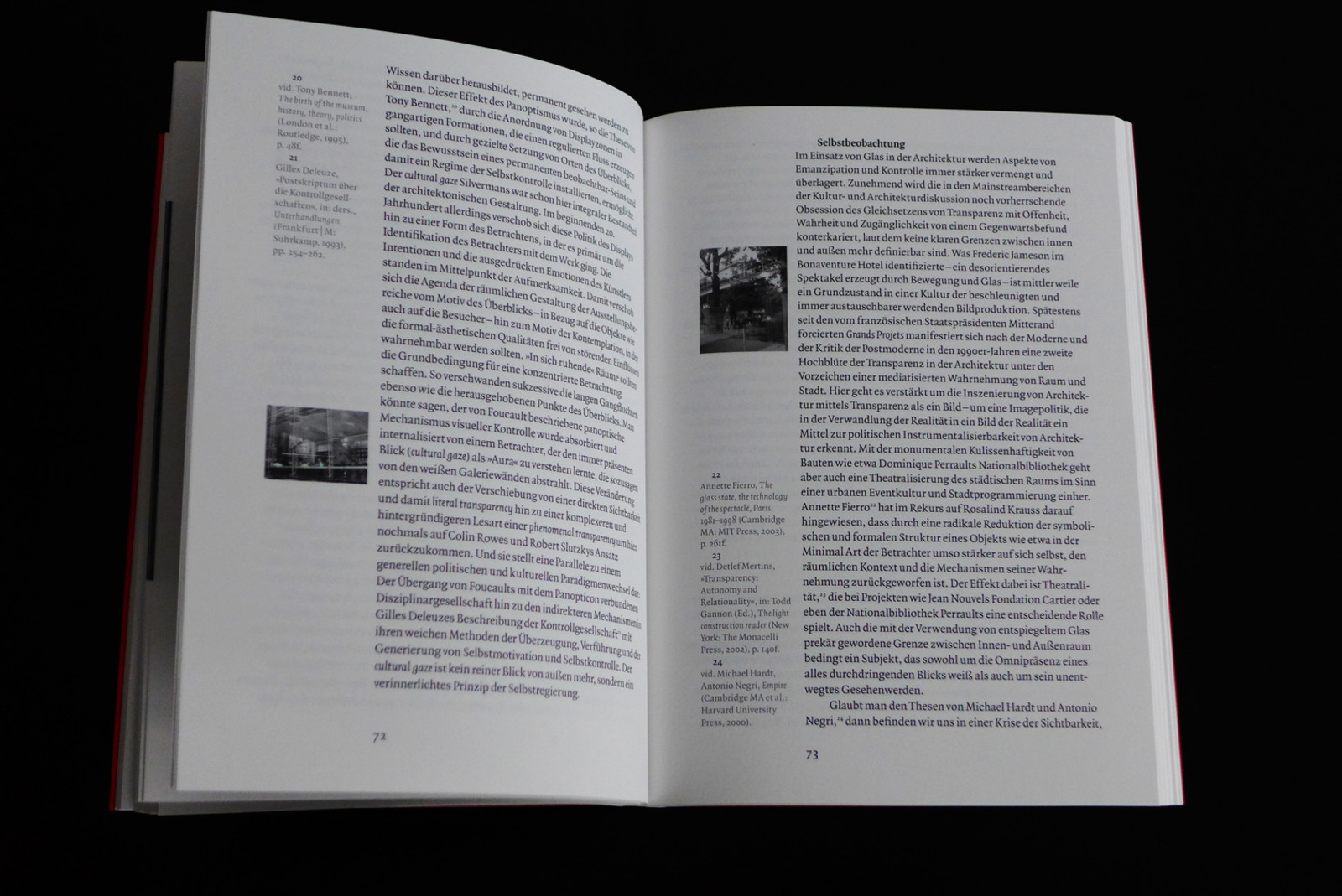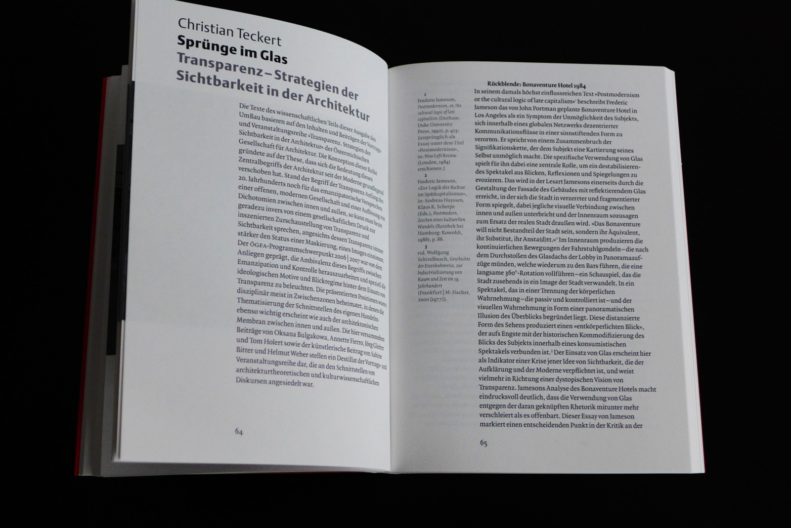 Kaum ein Begriff in der Alltagssprache der Architektur ist, wenn es um die Beschreibung der als positiv verbuchbaren Eigenschaften gegenwärtiger Gebäude geht, populärer als die vielbeschworene „Transparenz“. Auf allen Ebenen, von der Unternehmensorganisation über die Aussenwirkung von Institutionen bis hin zur Architektur ist die Rede von einem „mehr an Transparenz“. Hier scheint ein schon einmal in die Krise geratenes Paradigma der klassischen Moderne wieder auferstanden zu sein, allerdings unter veränderten Vorzeichen. Ging es Anfang des 20. Jahrhunderts um das emanzipatorische Versprechen einer offenen, modernen Gesellschaft und die Auflösung von Dichotomien zwischen Innen und Außen, so kann man heute geradezu von einem gesellschaftlichen Druck zur inszenierten Zurschaustellung von Sichtbarkeit sprechen, angesichts dessen Transparenz oft den Status einer Maskierung, eines Images einnimmt.